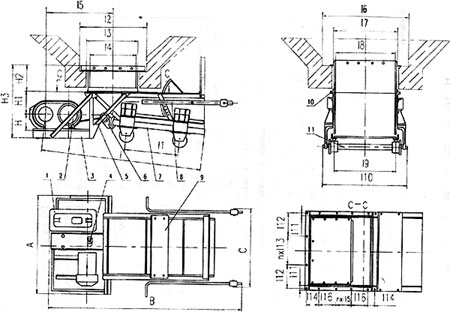 1、減速機 2、電動機 3、傳動平臺 4、聯軸器 5、H形架 6、連桿 7、給煤槽 8、閘門 9、機架 10、漏斗 11、托輥